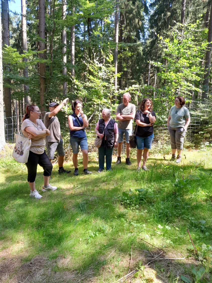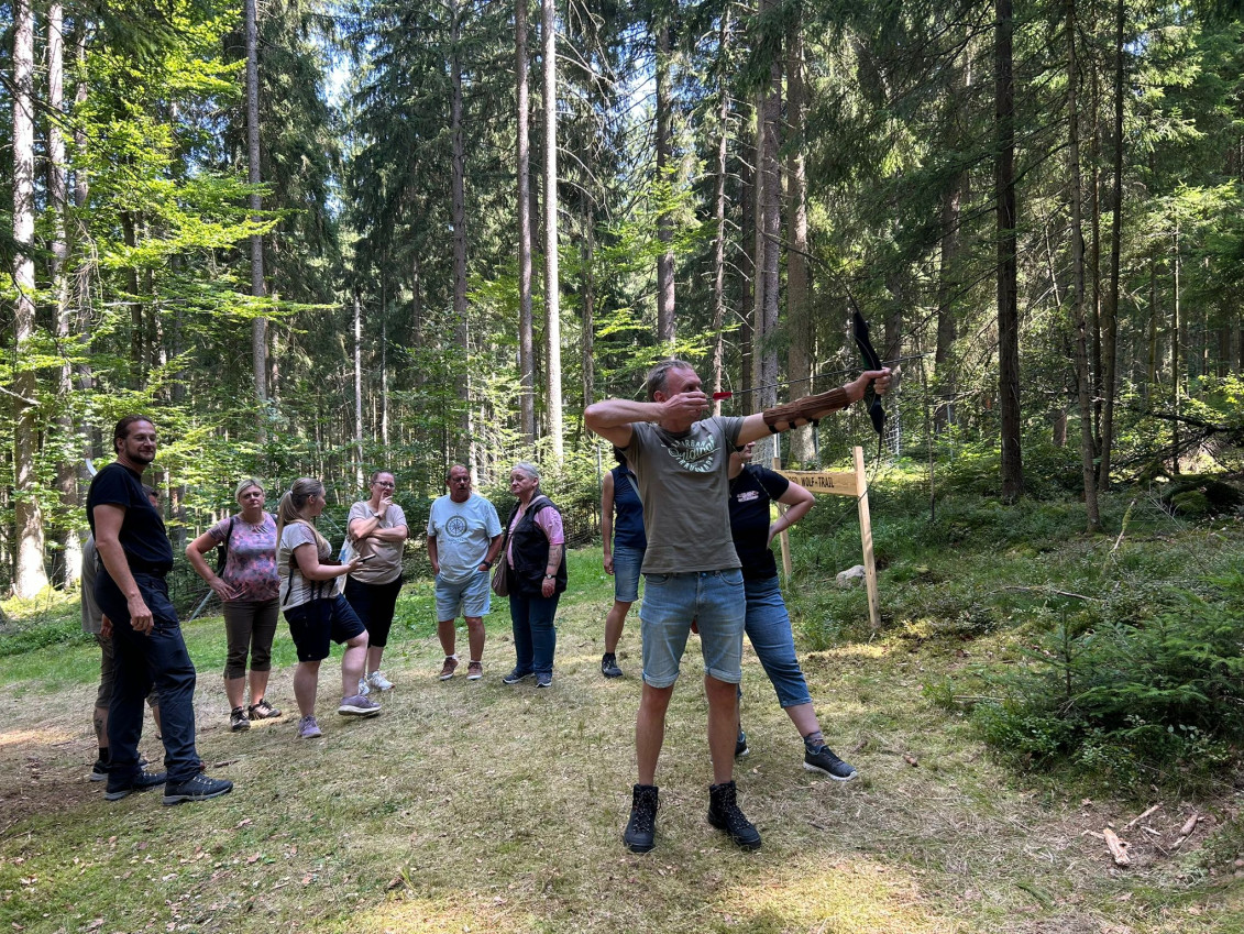 Bärbel Zandt, Chefin des Betreibers RedWulfArchery aus Tirschenreuth, informierte die Gruppe ausführlich über den gut zwei Kilometer langen Bogenpark mit 28 Zielen, hauptsächlich Waldtiere aus Kunststoff.